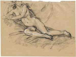 Ein für Hans Meid typischer weiblicher Akt, der durch den ausdrucksvollen Zeichenduktus Sinnlichkeit vermittelt.