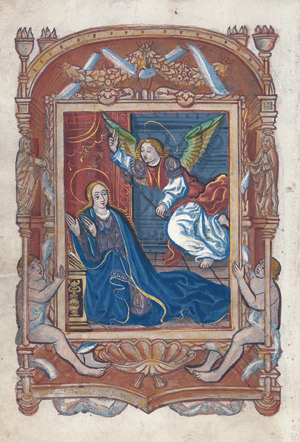 Miniaturen aus einem auf Pergament gedrucktem Frührenaissance-Stundenbuch vom Ende des 15. Jahrhunderts mit breiten vierteiligen Holzschnitt-Bordüren und Textdruck in Rot und Schwarz. Eingemalt sind 19 ein- bis dreizeilige Goldinitialen auf rotem und blauen, teils mit Goldfederornamenten dekoriertem quadratischen Grund. Die beiden Blätter (sicher aus demselben Druck) zeigen leuchtend kolorierte Miniaturen in Gold und Farben: Die Verkündigung mit der in azurblauen Brokatmantel gewandeten Maria, dem der Engel mit grünschillernden Flügel die Frohe Botschaft überbringt. Putten halten den Rahmen des Geschehens, der wiederum in eine ausladende Renaissancekartusche einbeschrieben ist mit Muschel- und Kandelaber-Elementen, Girlanden und Grotesken.
