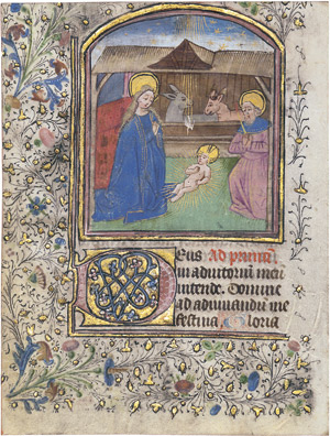 Drei Einzelblätter aus spätmittelalterlichen Pergamenthandschriften, aus den Horae Beatae Mariae Virginis. Zwei Blätter wohl aus derselben Handschrift, mit jeweils einer großen Miniatur (8 x 7 cm) und breiter Bordüre aus Dornblattranken mit Goldpunkten. Beide Blätter mit einer großen Schlingwerk-Initiale auf Goldgrund. Die Miniaturen zeigen Christi Geburt und die Verkündigung an die Hirten. Sehr feine Deckfarbenmalerei mit Goldhöhungen. Das dritte Blatt mit einer ungewöhnlicheren Szene des Weltgerichts. Christus zwischen Maria und Johannes erweckt die aus den Gräbern vor einer Berglandschaft mit Stadtsilhouette entsteigenden Seelen am Jüngsten Tage. In der floralen Akanthusbordüre erscheinen drei apotropäische Fabel- bzw. Monsterwesen. – Die beiden Blätter bis auf bzw. über den Rand stark beschnitten, alle etwas angestaubt, leicht fleckig, wenig Oberflächenabrieb.