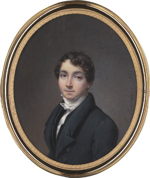 (1797-1849, Paris)Miniaturenpaar: Junge Frau in schwarzem Kleid mit langer Goldkette, vor wolkigem Himmelhintergrund, und junger Mann in dunkler Jacke mit schwarzer Weste und geknoteter weißer Halsbinde
