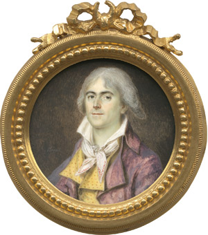 (tätig Ende des 18. Jahrhunderts in Frankreich)Bildnis eines jungen Mannes in altrosa Jacke mit rot bestickter gelber Weste und weißem Halstuch bestickt mit roter Bordüre