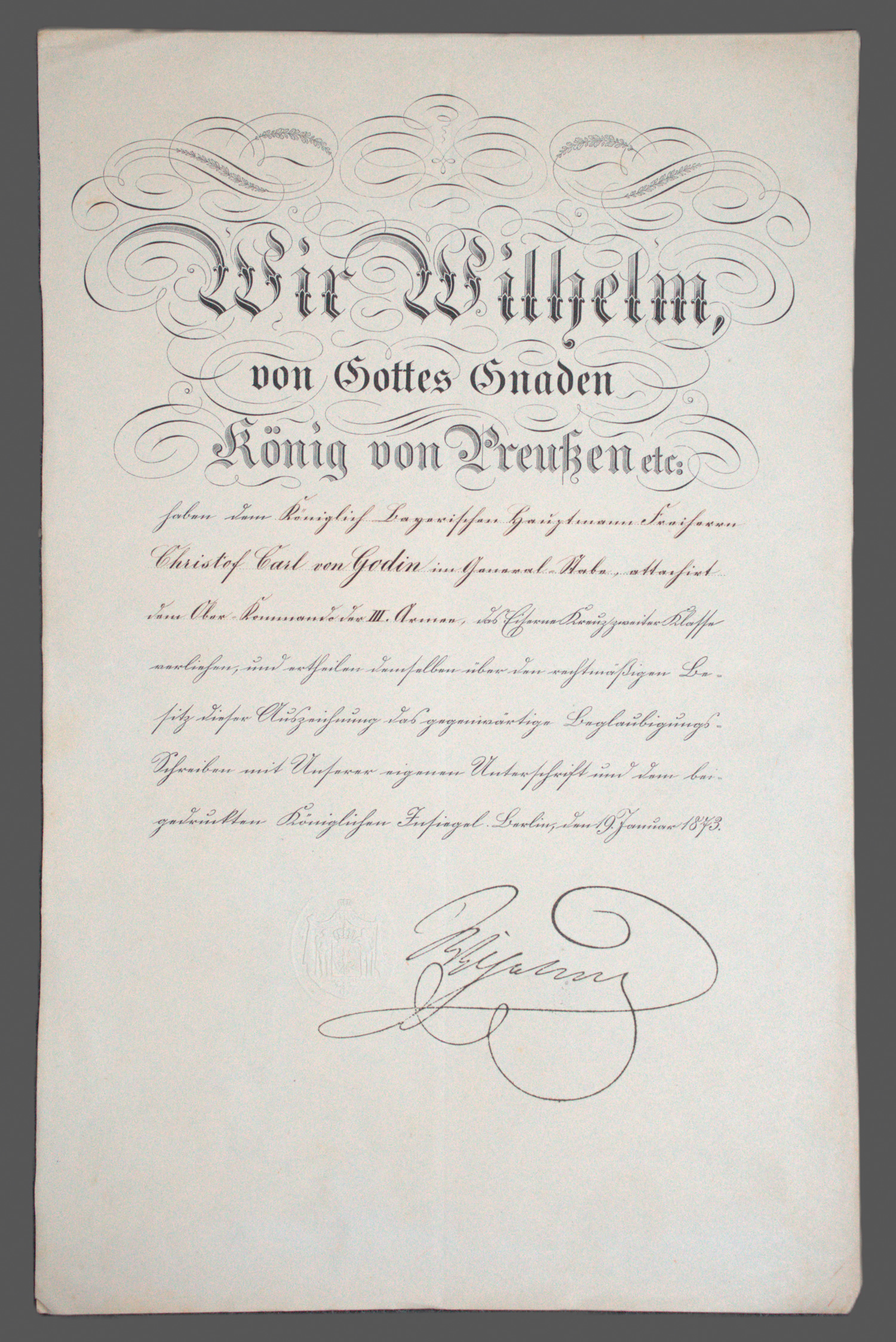 (1798-1888)Urkunde: Verleihung des Eisernen Kreuzes II. Kl. 1873
