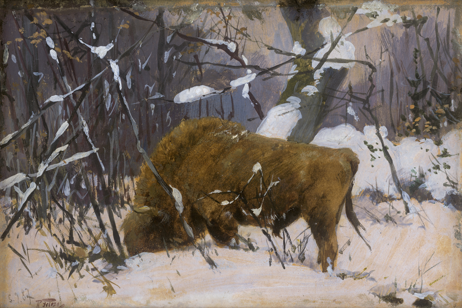 (1854 Gumbinnen/Ostpreußen (heute Gusev) - 1918 Bad Zwischenahn)Wisent im winterlichen Wald der Rominter Heide