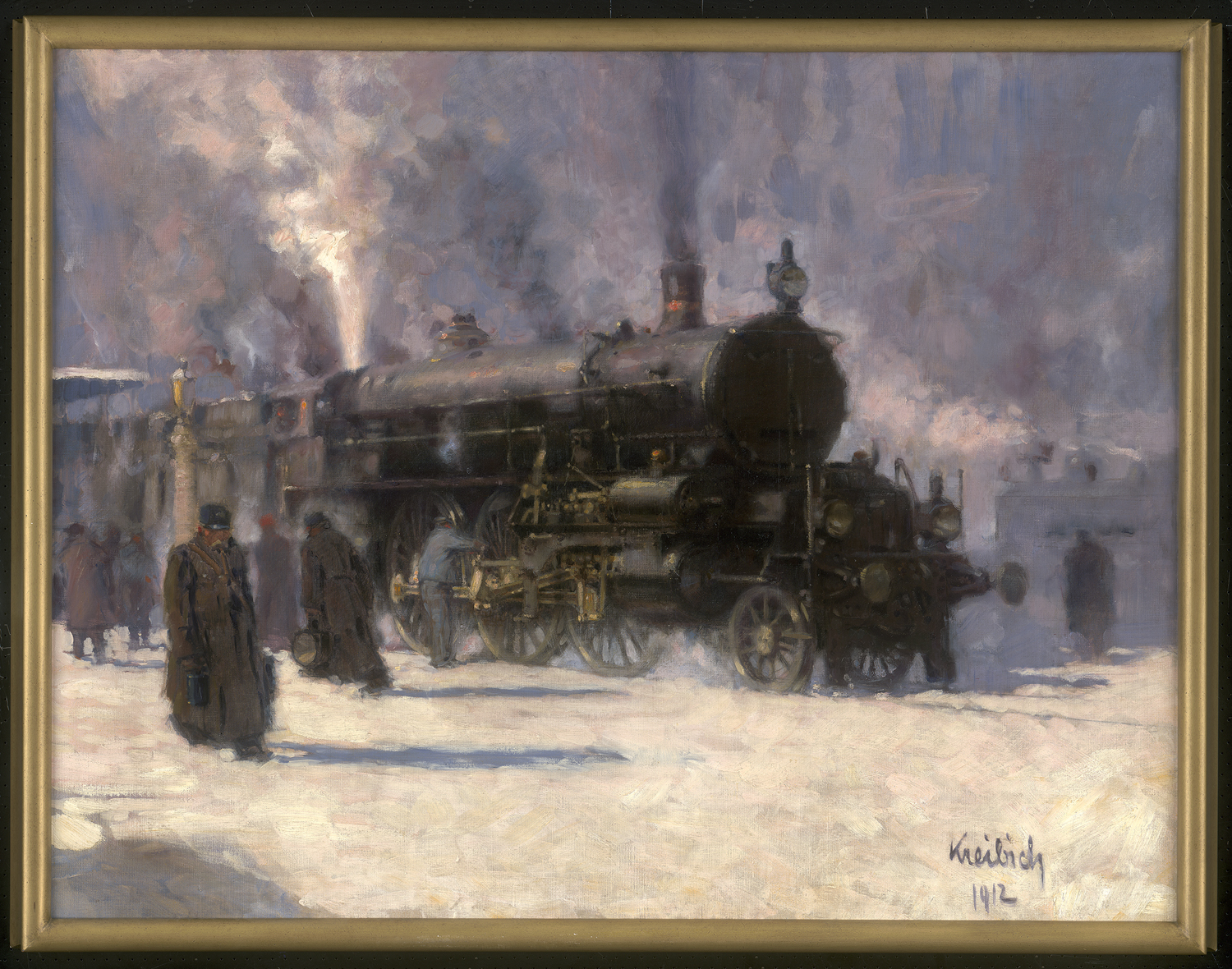 (1884 Zdice - 1955 Prag)Vor der Abfahrt: Dampfende Lokomotive am winterlichen Gleis