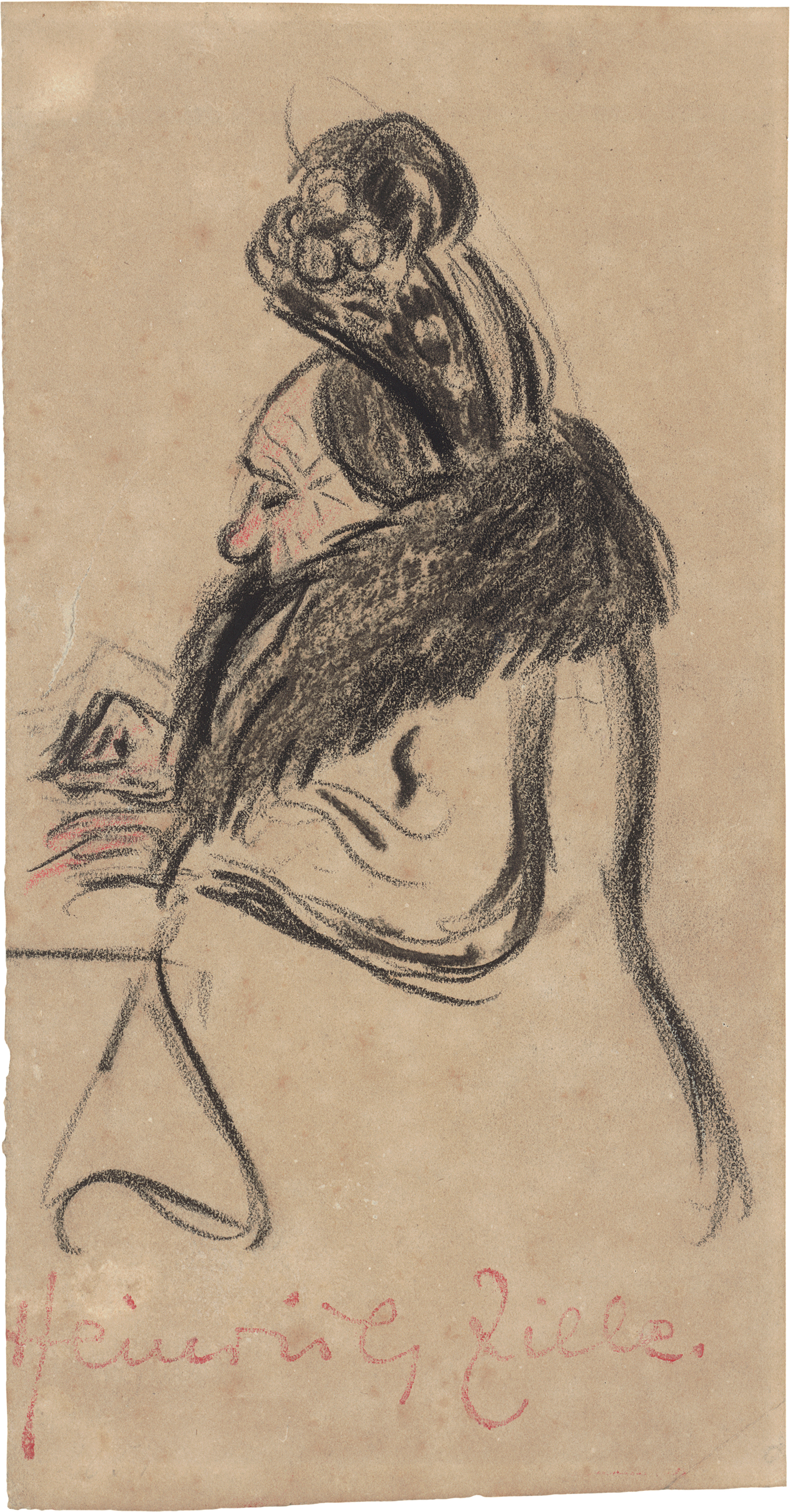 (1858 Radeburg bei Dresden - 1929 Berlin)Alte Dame in pelzbesetztem Mantel, an einem Tisch sitzend