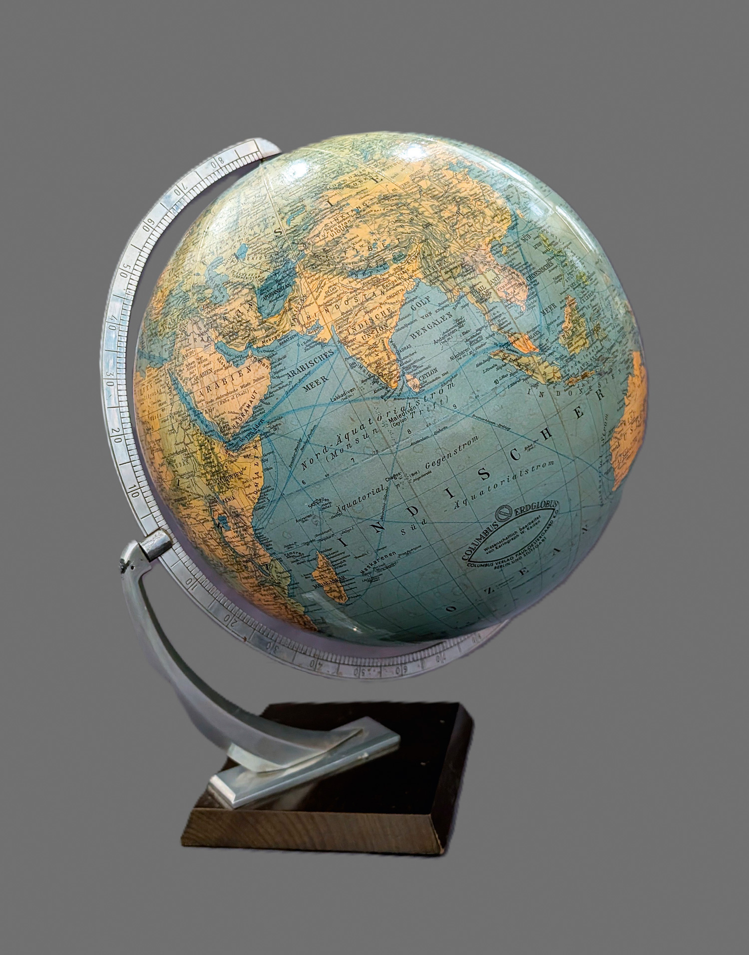 Mit Halbmeridian-Skala und Gestell aus Aluminium auf Holzplatten-Sockel. Höhe: 50 cm. Durchmesser: 55 cm. Berlin und Stuttgart, Columbus Verlag Paul Oestergaard K.G., 1950er Jahre.