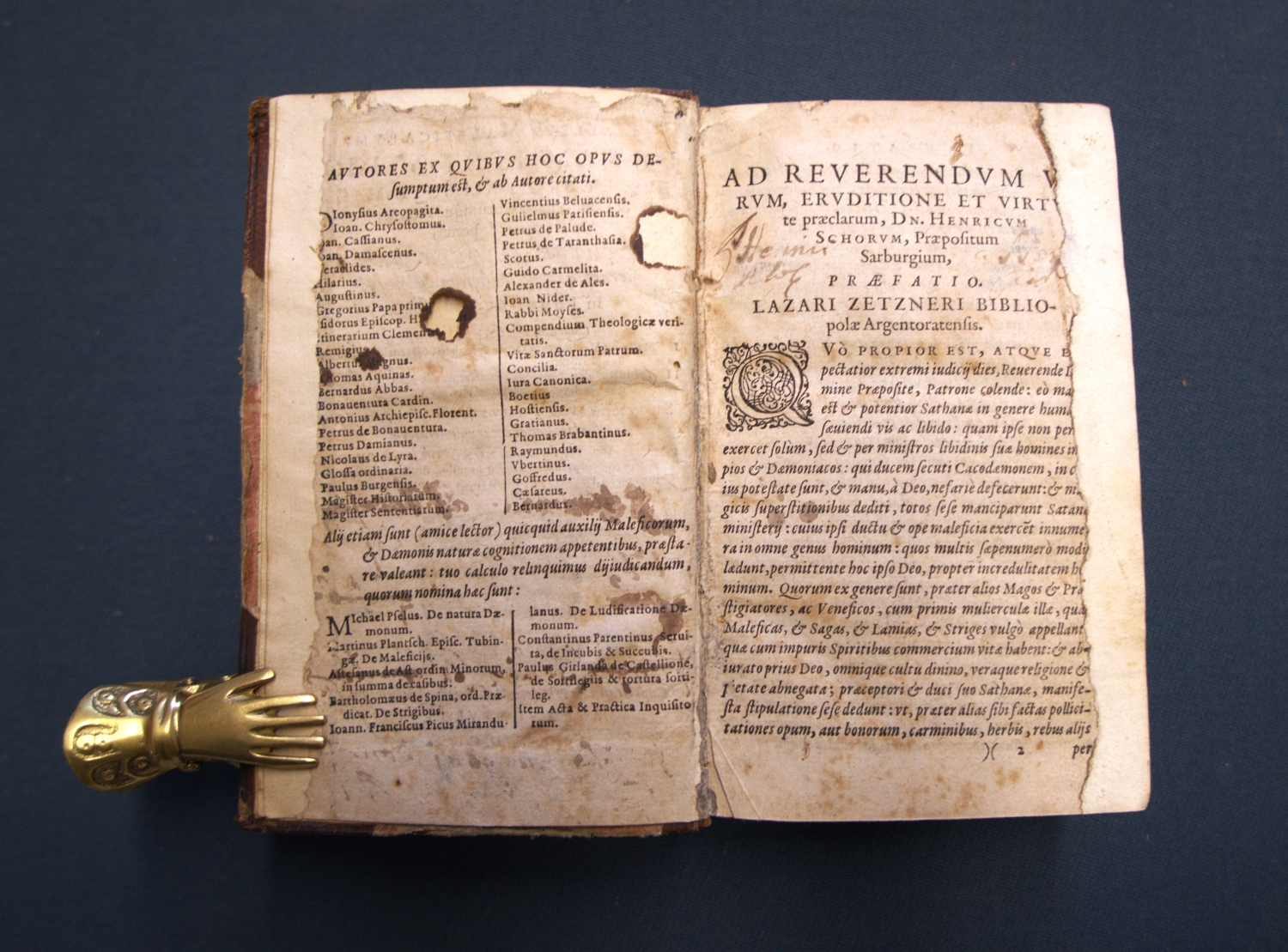 Die Autorschaft seines Mitbruders Jakob Sprenger, die auch im vorliegenden Exemplar, das von dem Servitenmönch Raffael Maffei herausgegeben und überarbeitet wurde, erhalten blieb, ist nach heutigem Forschungsstand hingegen umstritten und wird als Verleumdung beschrieben, da Sprenger sich als Gegner der Hexenverfolgung bekannte (Vgl. Tschacher, Lexikon zur Geschichte der Hexenverfolgung). – Nur der erste Band vorhanden. Knapp beschnitten, Titel mit Fehlstelle (Text etwas betroffen), ersten sechzehn Blätter mit größerer bis kleinerer hinterlegten Fehlstelle am Außensteg, die letzten fünfundzwanzig Seiten mit Feuchtrand sowie durchgehend etwas stockfleckig.