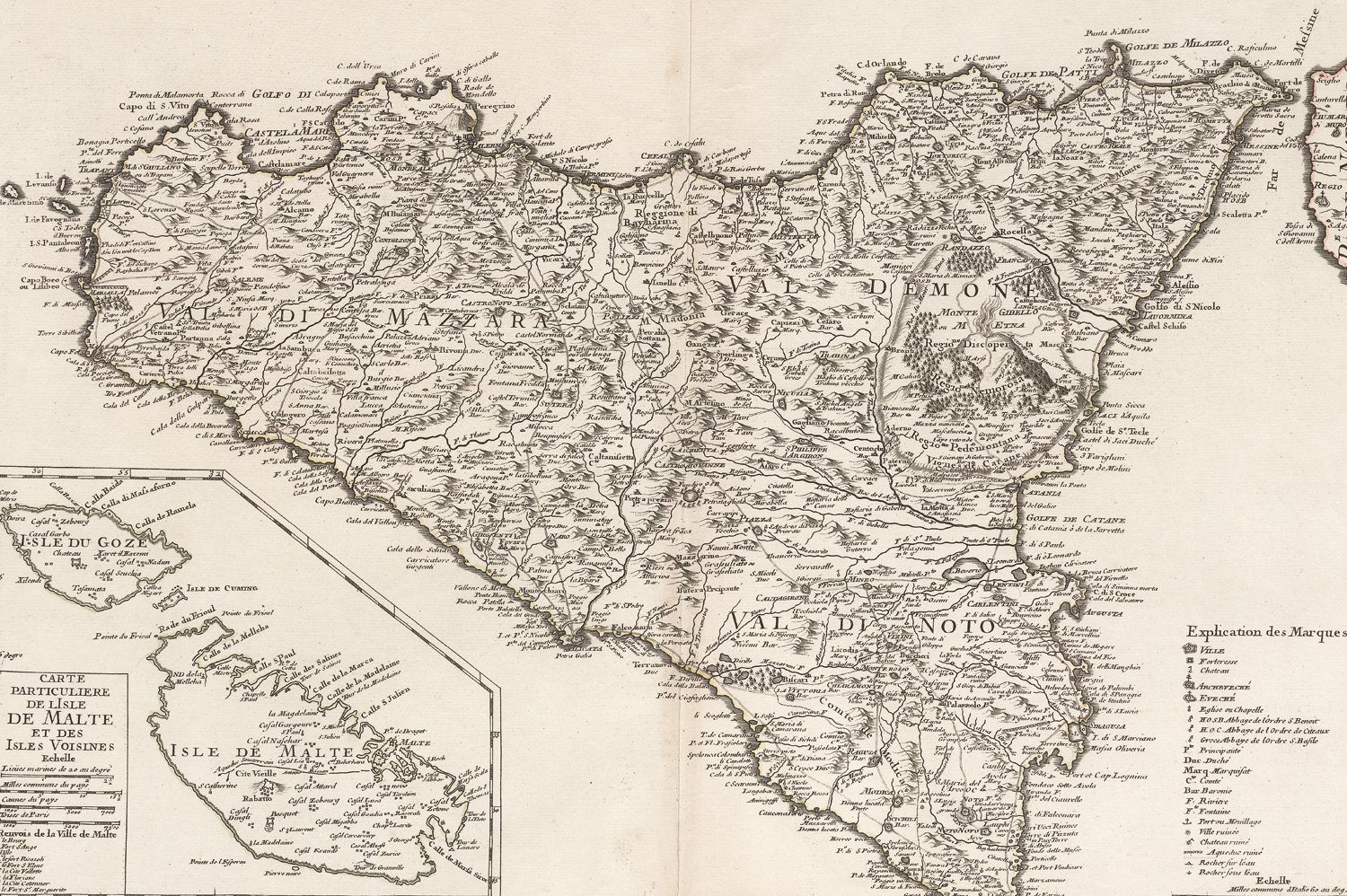 Buache, Philippe. Carte de l'Isle et royaume de Sicile. Grenzkolorierte Kupferkarte. 49 x 59 cm (Plattenrand). Paris 1717.