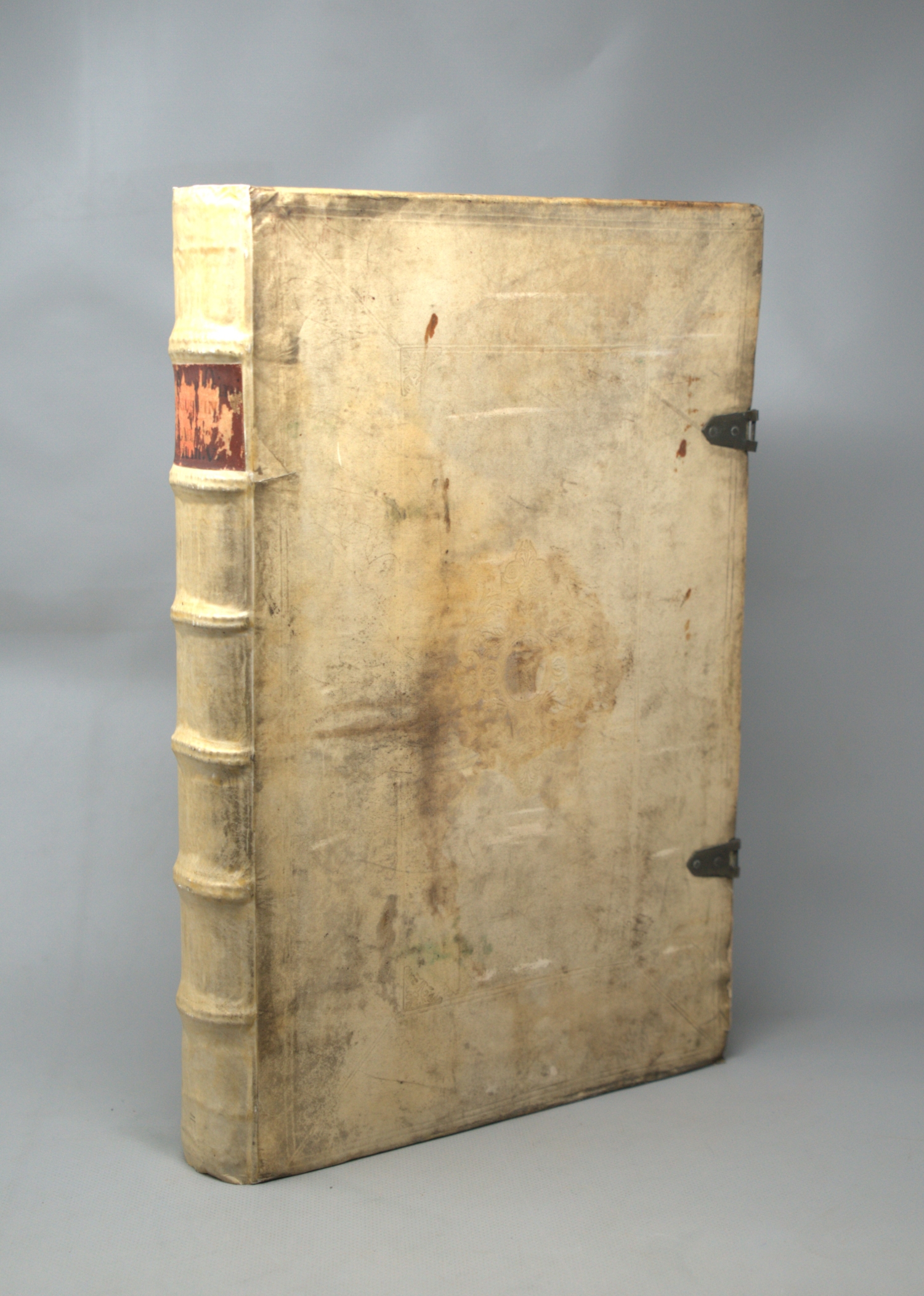 Augustinus, Aurelius. Opera omnia. 11 Teile in 7 Bänden. Mit 2 Titelkupfern und 8 Titelholzschnitten. 39 x 24,5 cm. Blindgeprägtes Pergament d. Z. (leicht fleckig, stellenweise feuchtrandig, teils mit Fehlstellen im Bezug, etwas bzw. auch stark angeschmutzt) mit hs. RSchild. Lyon, J. Radisson, 1664.