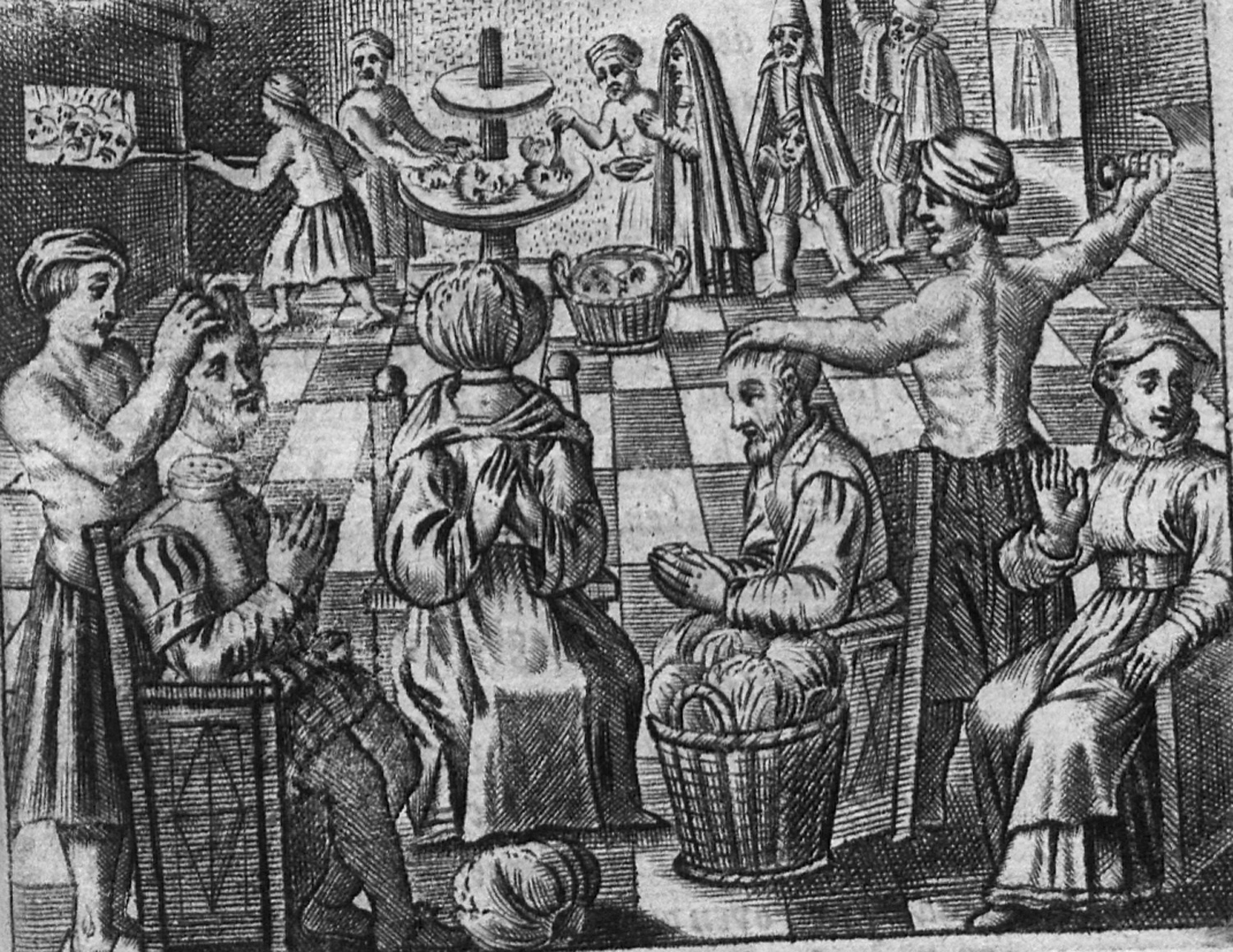 Poirters, Adriaan. Het masker vande wereldt afgetrocken. Vermeerdert, verbetert. VII. Druck. 15 Bl., 439 S. Mit gestochenem Titelblatt und 26 Textkupfern. 15 x 9,5 cm. Pergament d. Z. (fleckig und berieben, Rücken lädiert, VDeckel mit Ausriss, Bindebänder fehlen) mit hs. RTitel. Antwerpen, Jan Cnobbaert, (1649).