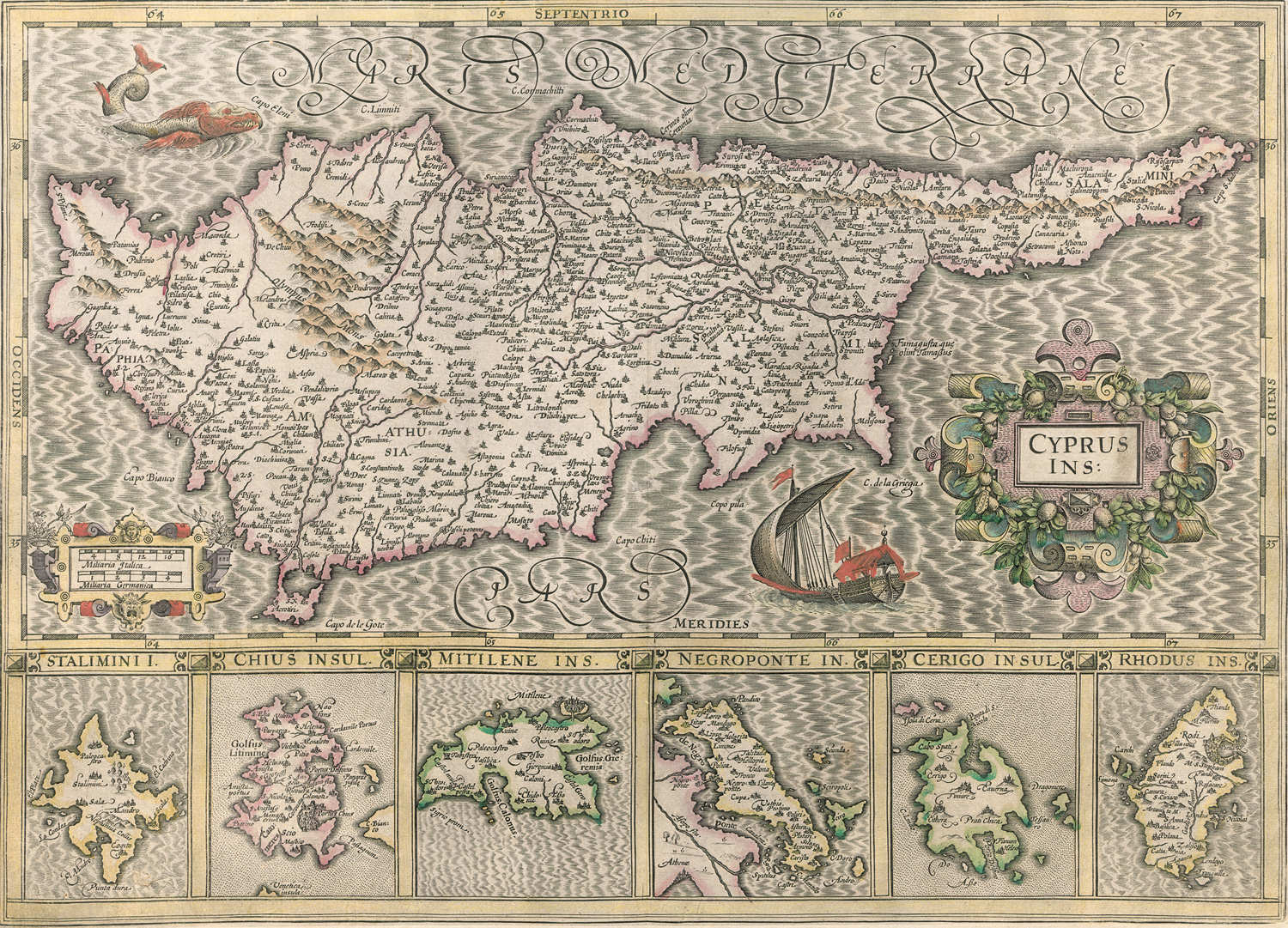 Besonders schöne Karte Zyperns und den sechs griechischen Inseln Stalimini, Chios, Lesbos (Mitilene), Negroponte (Euböa), Cerigo und Rhodos, aus der lateinischen Ausgabe des Mercator-Hondius-Atlasses. – Leicht fleckig und mit Mittelfalz.