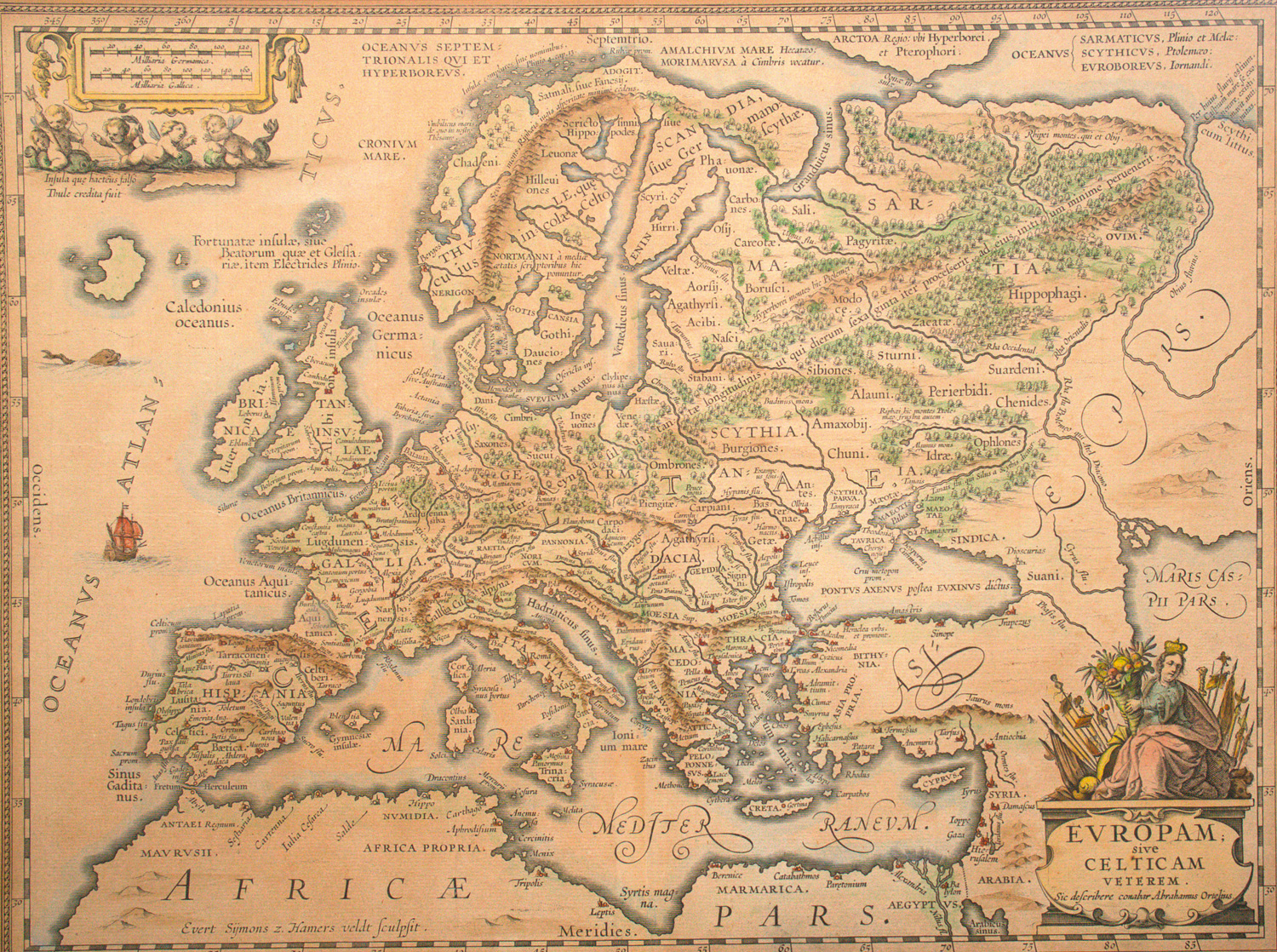 Janssonius, Johannes. Europam sive Celticam veterem. Sic Describere conabur Abrahamus Ortelius. Kolorierter Kupferstich nach Abraham Ortelius. 35,5 x 47,5 cm (Plattenrand). Amsterdam 1642.