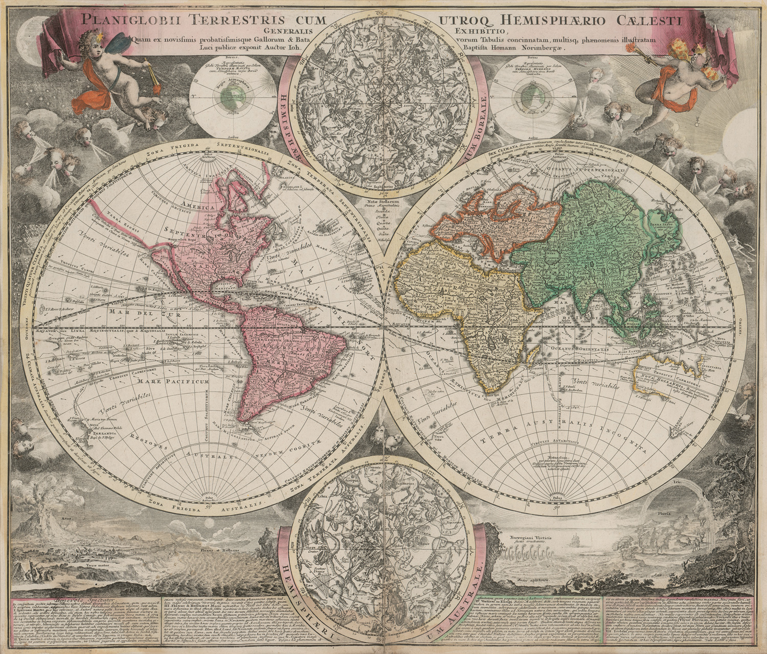 Homann, Johann Baptist. Planiglobii terrestris cum utroq hemisphaerio caelesti generalis exhibitio. Kolorierter Kupferstich, von zwei Platten gedruckt und zusammenmontiert. 50 x 58 cm. (Darstellung). Mit Passepartout unter Glas in lackierter Holzprofilleiste. Nürnberg, Homann, 1720.