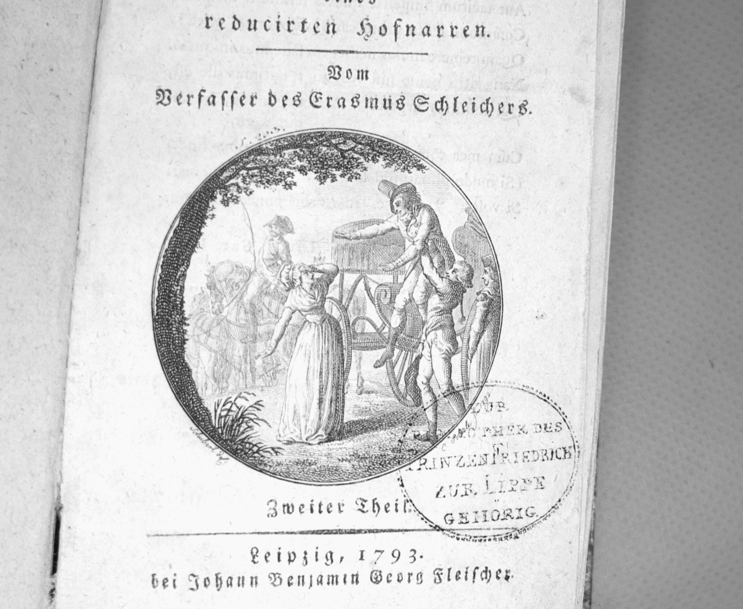 (Cramer, Carl Gottlob). Leben und Meinungen auch seltsamliche Abenteuer Paul Ysops, eines reduzirten Hofnarren. 2 Bände. 3 Bl., X, 392 S.; XVI, 343 S. Mit 2 gestochenen TVignetten und gefalteter Musikbeilage. 15,5 x 9 cm. Pappband d. Z. (berieben, Rückenbezug mit Schabstellen, Ecken leicht bestoßen, mit Resten eines hs. RSchilds). Leipzig, Johann Benjamin Georg Fleischer, 1792-1793.