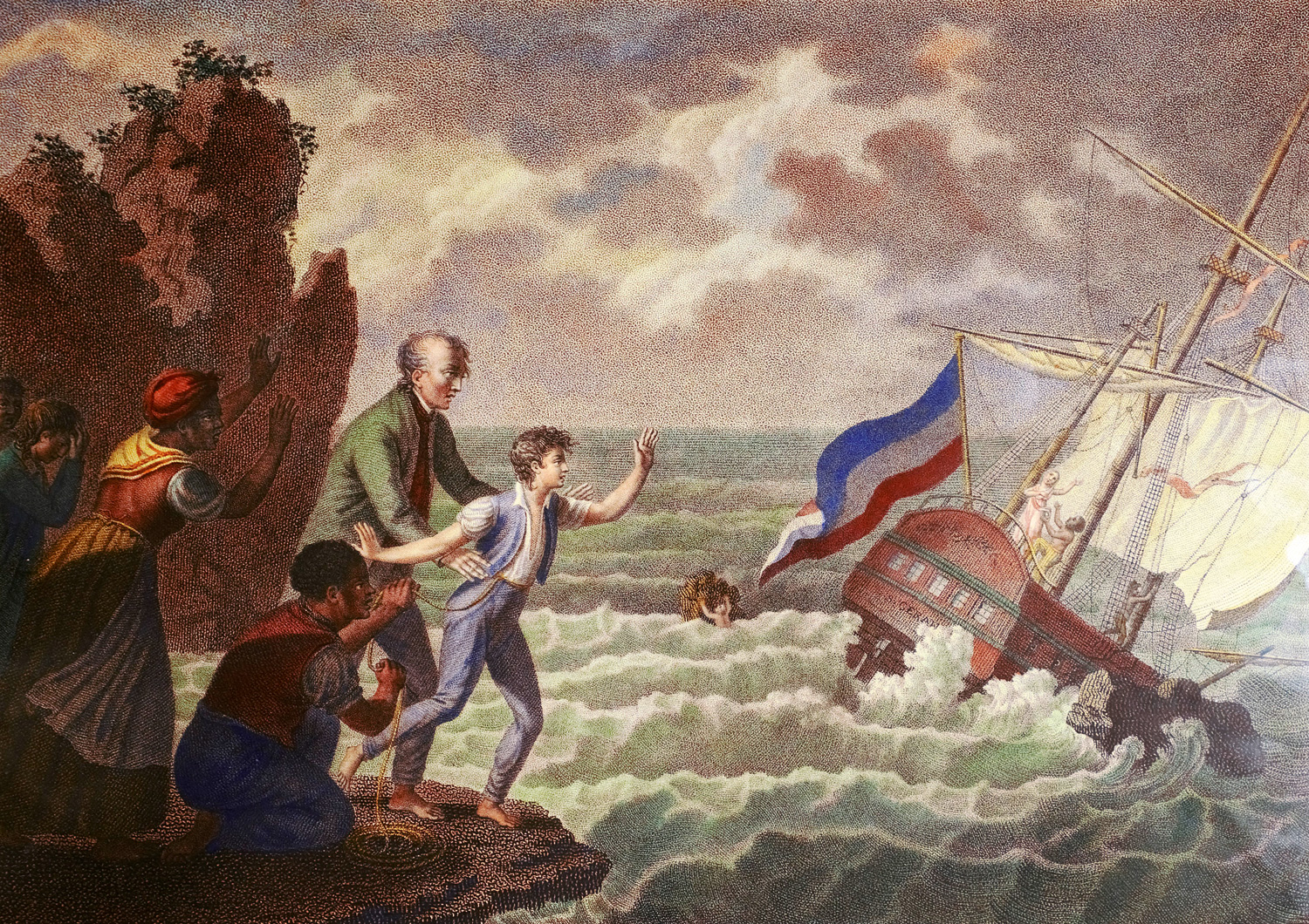 Wunderbare Stiche zu der Tragödie von Jacques-Henri Bernardin de Saint-Pierre (1737-1814). Mit den Szenen "Le Naufrage de Virgine", "Les adieux de Virgine", "Paul et Virginie surpris par la pluie", "Le repos de Virgine", "Paul et Virginie avec l Gouverneur" und "Paul et Virginie retrouvés". – Teils etwas lichtrandig, braunfleckig und minimal feuchtrandig. Nicht ausgerahmt, Versand nur ohne Rahmen.