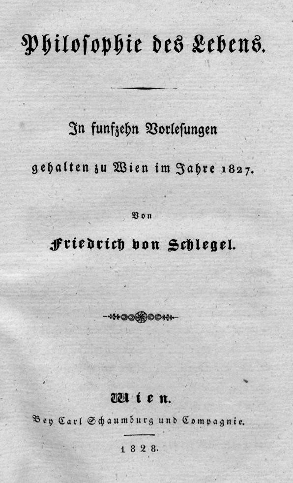 Schlegel, Friedrich von. Philosophie des Lebens. In funfzehn Vorlesungen gehalten zu Wien im Jahre 1827. 2 Bl., 482 S., 1 Bl. 19,5 x 13 cm. Pappband d. Z. (Ecken etwas bestoßen) mit goldgeprägtem RSchild. Wien, Carl Schaumburg, 1828.