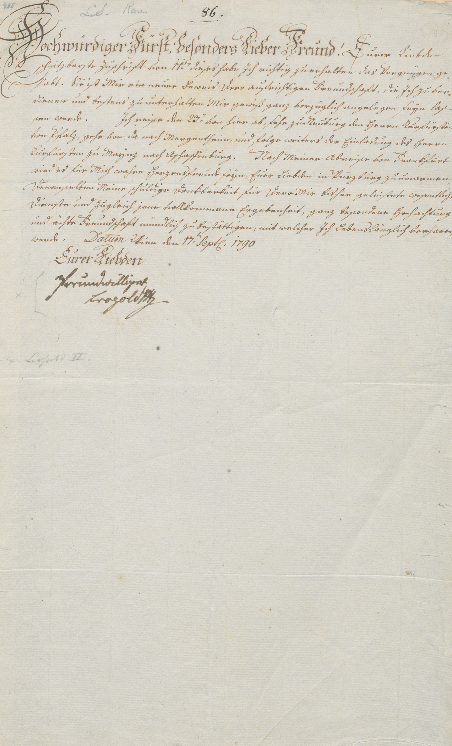 (1747-1792)Brief an einen Fürsten, vor der Krönungsreise. 1790