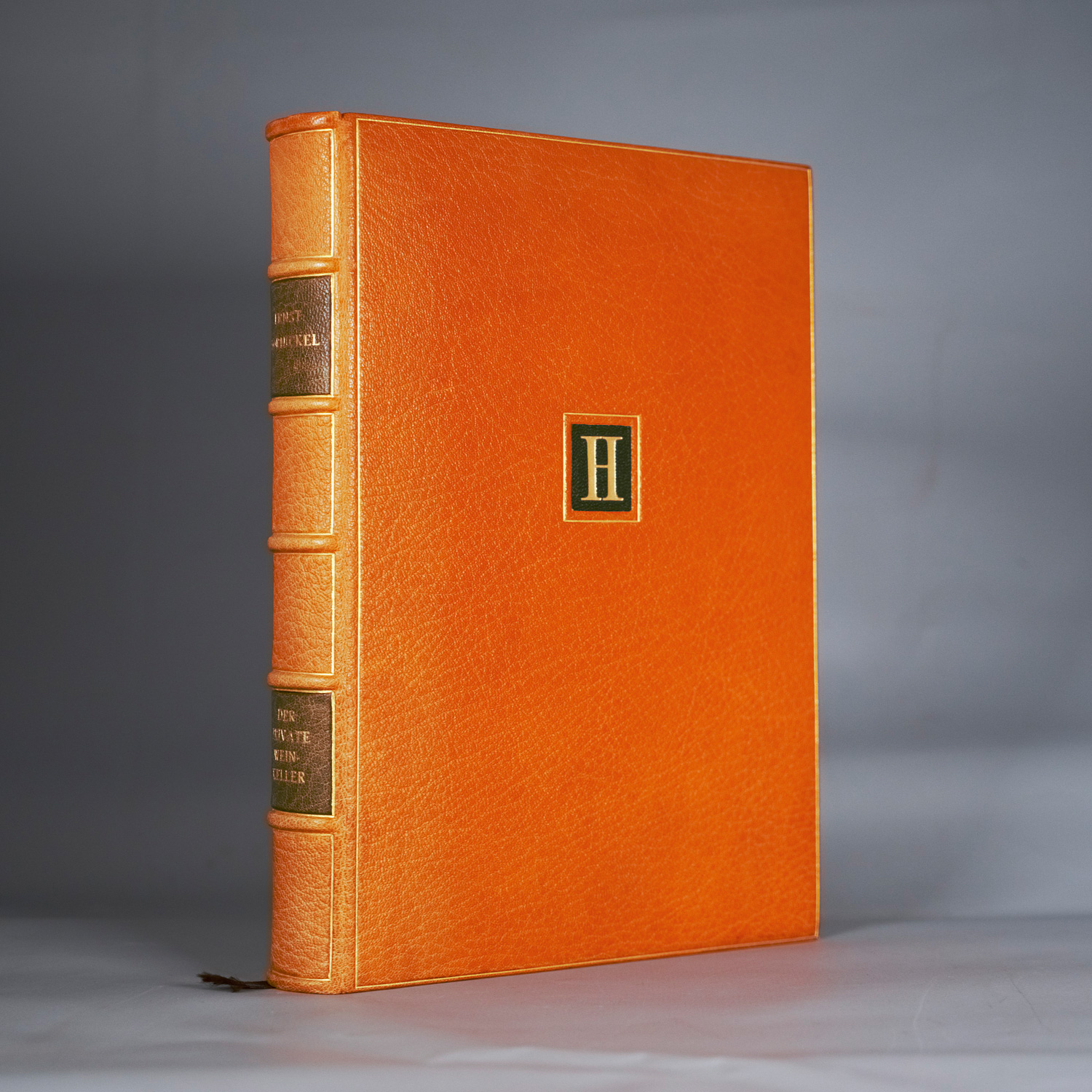 Einband. - Orangefarbener Maroquinband über 5 Bünde mit goldgeprägtem RSchild, goldgeprägten DFileten und goldgeprägtem Monogramm auf dem Vorder- und RDeckel sowie goldgeprägten Steh- und Innenkanten sowie Kopfgoldschnitt von Gottfried Gaus. 26 x 18,5 cm. Hannover 1965.