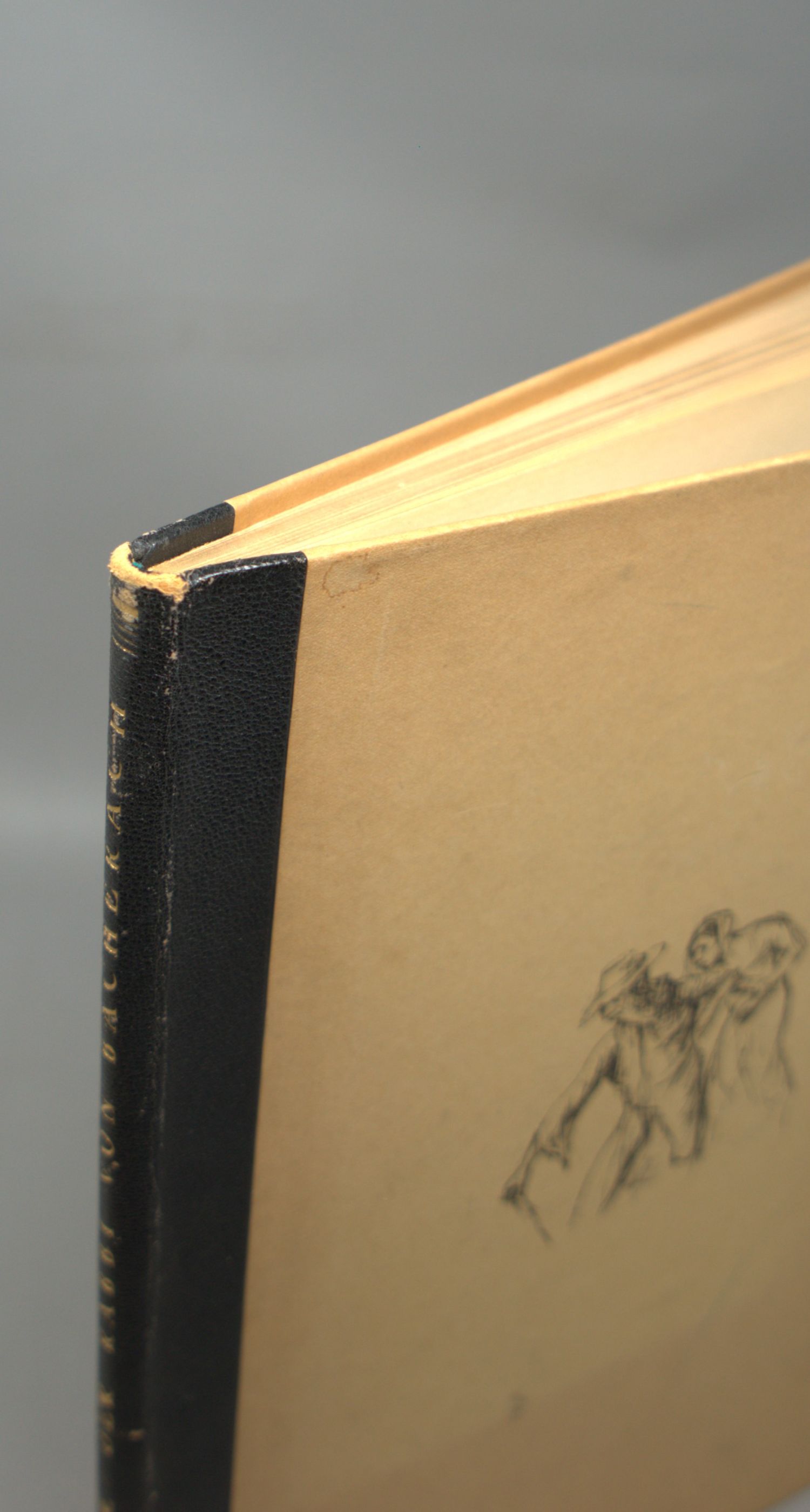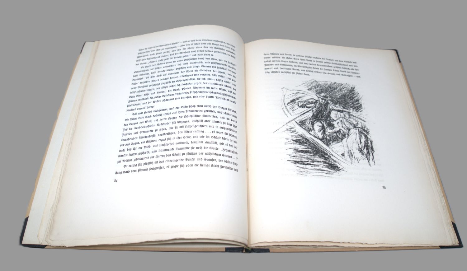 Heine, Heinrich. Der Rabbi von Bacherach. 57 S., 2 Bl. Mit 17 (davon 1 signiert) Orig.-Lithographien von Max Liebermann. 34 x 27 cm. Illustrierter OHalblederband (schwach fleckig und lichtrandig, Ecken und Kapitale berieben) mit goldgeprägtem RTitel. Berlin, Propyläen, 1923.
