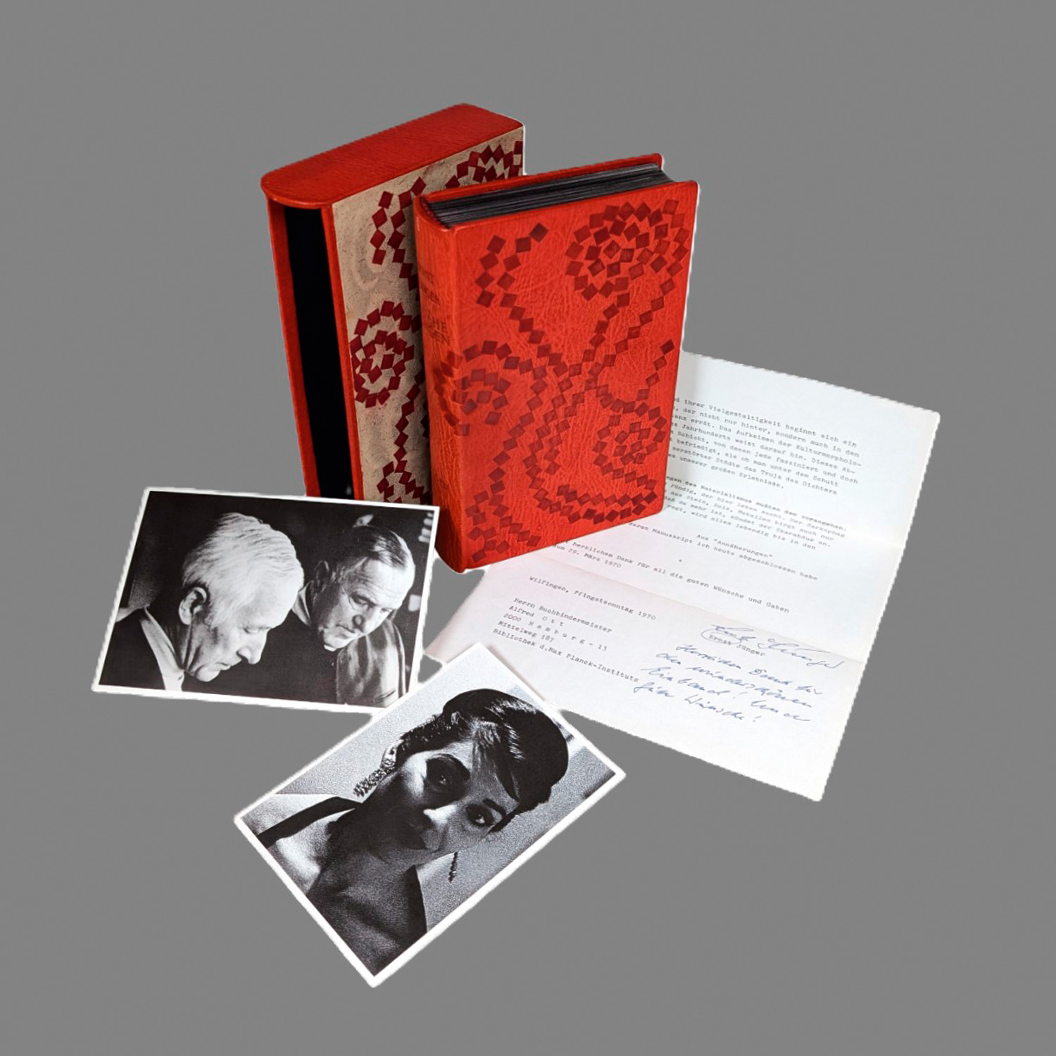 Des Coudres B 65a. Wilpert-G.2 114. – Erste Ausgabe. Exemplar der Normalausgabe im Meistereinband des Hamburger Buchbinders Alfred Ott. Vortitel mit blattfüllendem Eigenzitat und einer Widmung von Ernst Jünger (datiert: "W. 7.IX.1973"). – Tadelloses Exemplar in einem besonderen Einband. – Dabei: Maschinenschriftl. Dankesschreiben von Ernst Jünger (mit eigenh. Unterschrift und Dankeszeilen) an den Buchbinder Alfred Ott, 1 Bl., datiert: Wilflingen, Pfingstsonntag 1970. - Zwei Postkarten des "Jünger-Detektivs" Tobias Wimbauer.
