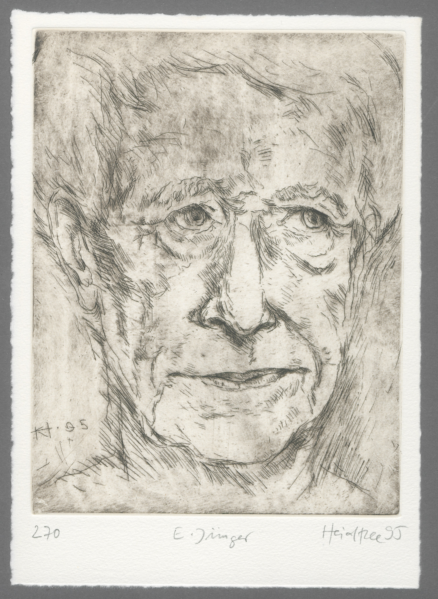 Eines von 270 numerierten Exemplaren (Gesamtauflage 300 Ex.) mit der signierten Radierung von J. Heidtke (Portrait Ernst Jünger). Der Text wurde den Sämtlichen Werken, Band 10 (Subtile Jagden) entnommen. – Tadellos. – Dabei: George Orwell. Erinnerungen an eine Buchhandlung. Jahresgabe Antiquariat Bürck. 8 Bl. Mit Illustrationen und einem separaten signierten und nummerierten Originalholzschnitt von Wilhelm Scharch. 24 x 16,5 cm. OBroschur mit Fadenheftung. Berlin 1994. - Eines von 200 nummer. und vom Künstler sign. Exemplaren (Gesamtauflage). Mit Widmung des Antiquars Bürck.