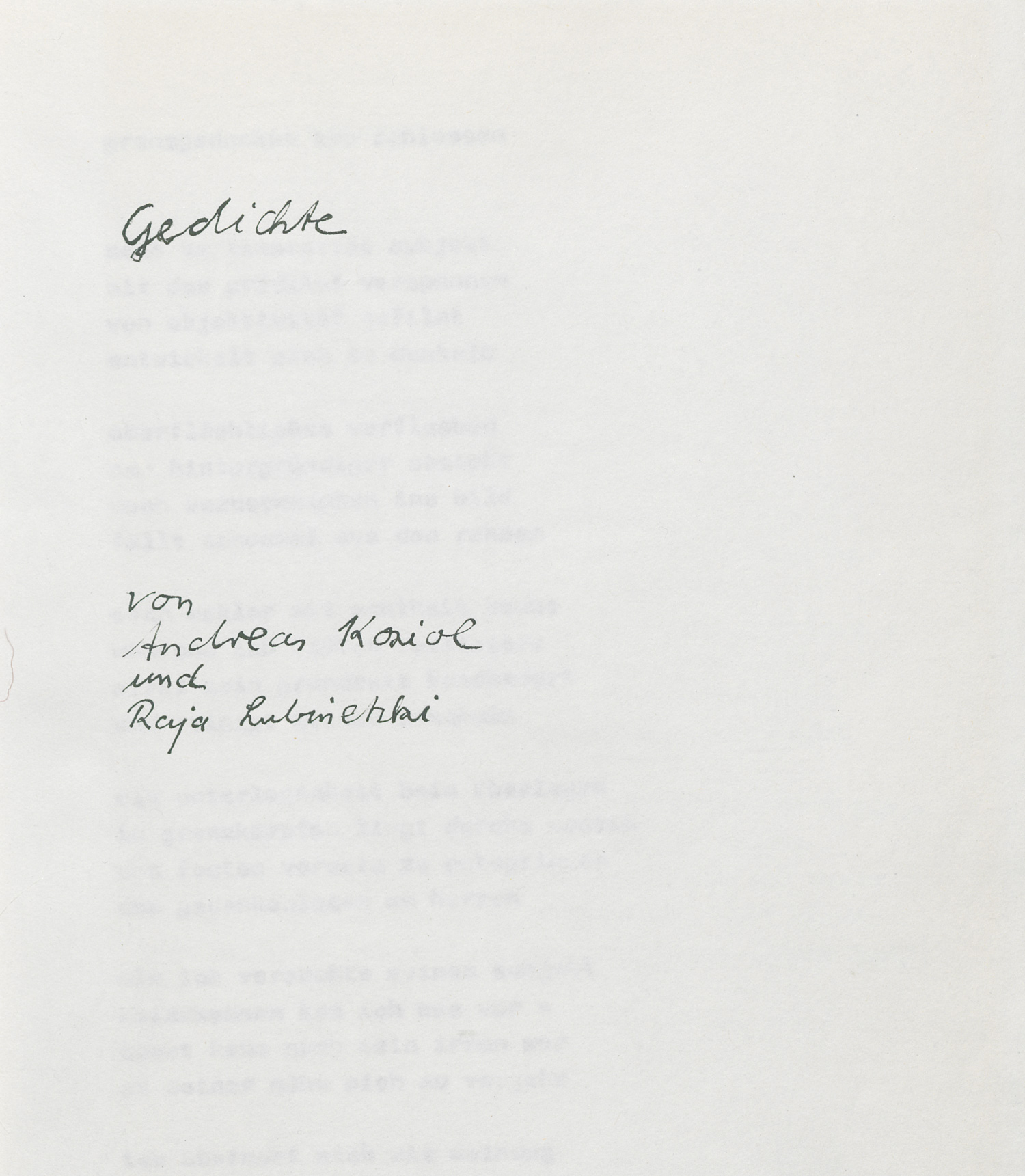 Nicht bei Eckart. – Eines von 20 nummerierten Exemplaren (Gesamtauflage). Als Typoskript vervielfältigter Lyrikband (jeweils einseitig bedruckte DinA4-Blätter) der beiden Mitglieder der Künstler- und Literatenszene am Prenzlauer Berg (Andreas Koziol, 1957-2023, Raja Lubinetzki, geb. 1962 in Kropstädt). – Tadellos.