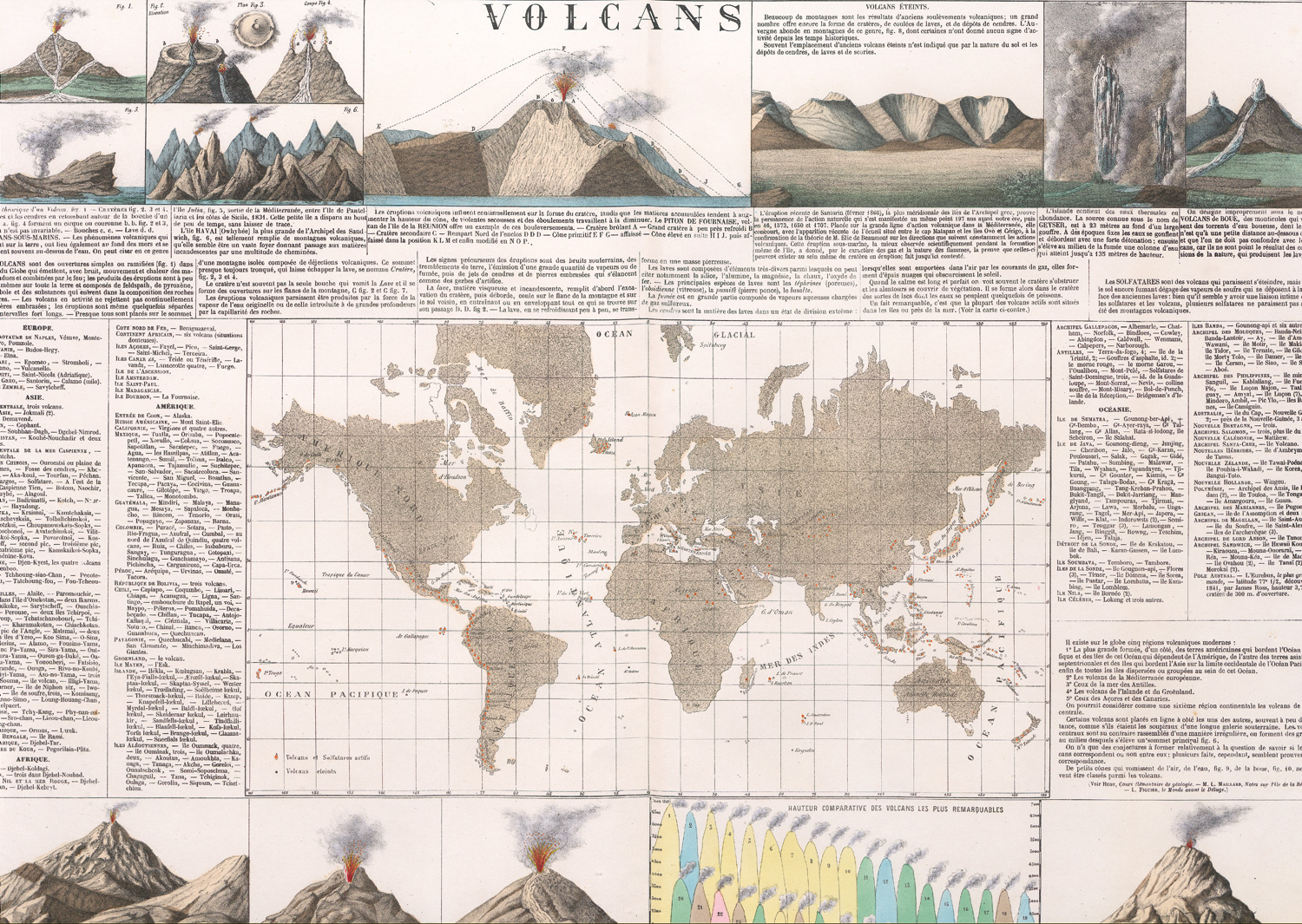 Dargestellt ist eine Vulkankarte. In der Mitte der Tafel befindet sich eine Weltkarte, auf der alle Vulkane der Welt eingezeichnet sind: Aktive Vulkane und Solfataren sind mit einem roten Punkt gekennzeichnet, erloschene Vulkane mit einem schwarzen Punkt. Die Liste der Vulkane, sortiert nach Kontinenten, befindet sich auf beiden Seiten der Karte. Am Ende der Liste befindet sich eine Anmerkung zu den fünf modernen Vulkanregionen.