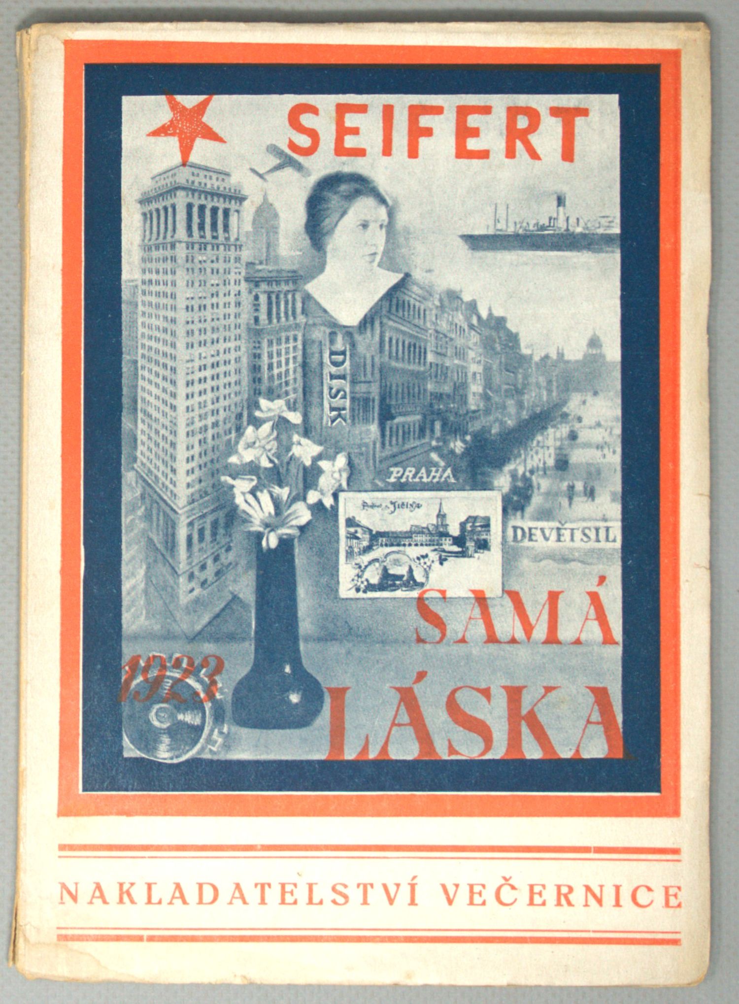 Seifert, Jaroslav. Sama laska. (Tschechischer Druck: Nichts als Liebe). Verse. 62 S., 1 Bl. Mit 4 Zeichnungen auf Tafeln. 19,5 x 14 cm. Farbig illustrierte OBrochur (gering fleckig und berieben) nach einer Photocollage des Wenzelsplatzes mit Phantasiearchitektur von O. Mrkvicka. Prag, Vecernice, 1923.