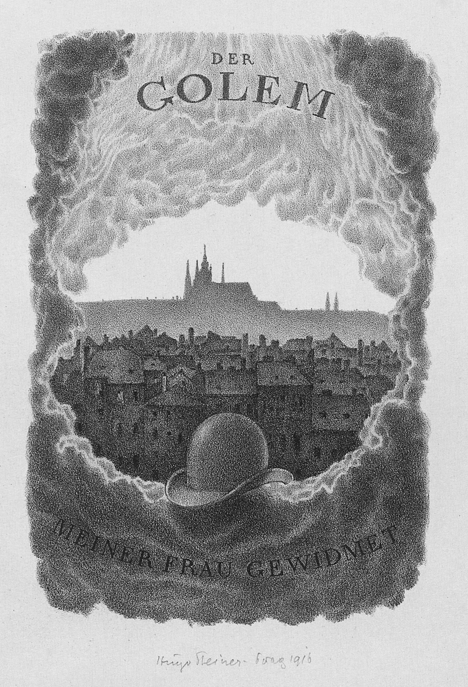 Steiner-Prag, Hugo. Der Golem. Prager Phantasien. Lithographien zu Gustav Meyrinks Roman. Doppelblattgroßer typographischer Titel mit Impressum sowie 25 Bl. Original-Lithographien unter Passepartouts. 50 x 36 cm. Lose Blatt in OHalbpergament-Flügelmappe (diese berieben, innen stockfleckig) mit goldgepr. VDeckeltitel. Leipzig, Kurt Wolff, 1916.