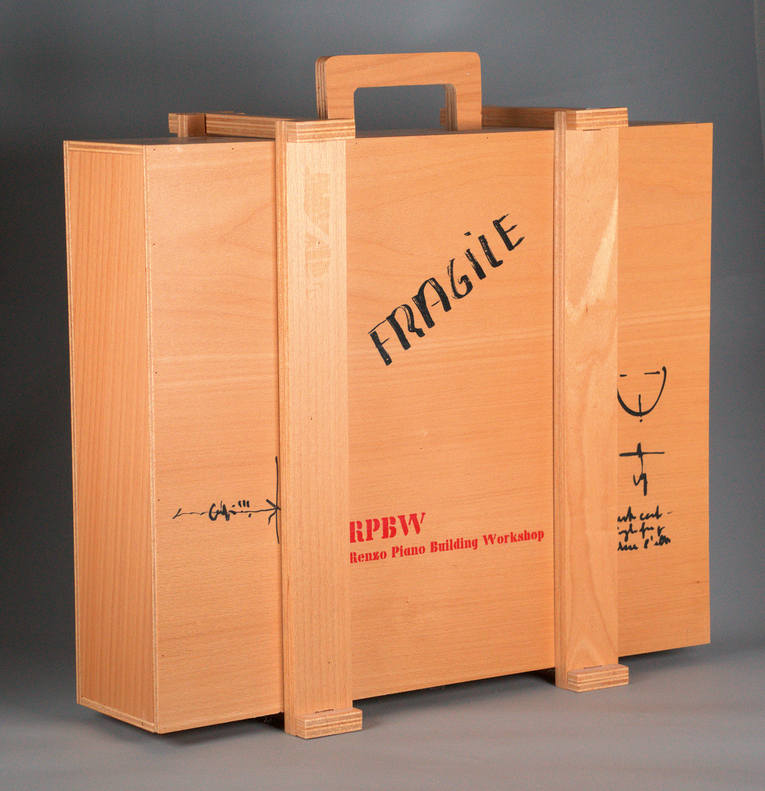 Eines von 200 nummerierten Exemplaren (Gesamtauflage: 220 Ex.) der Vorzugsausgabe des Werkverzeichnisses mit dem von Piano signierten Farb-Print von einer Entwurfszeichnung, die aus der Menil Collection Foundation in Houston stammt. In einer von Piano entworfenen, maßgefertigten Holzkiste, wie sie auch in seiner Werkstatt für den Versand von 3D-Miniaturgebäuden verwendet wird. – Tadelloses Exemplar.
