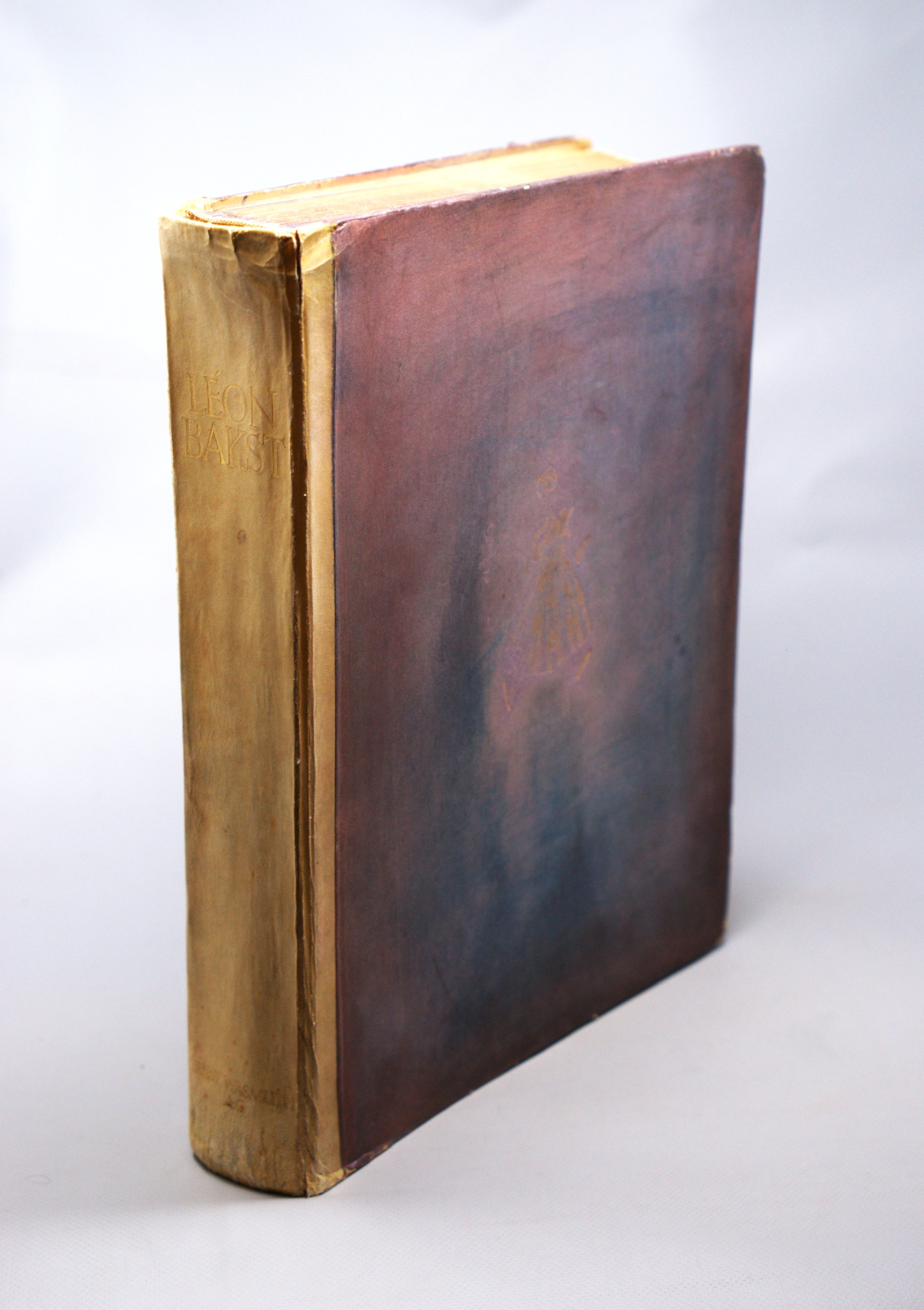 Levinsohn, André. Leon Bakst. (Deutsche Ausgabe). 233 S. Mit 54 (47 montierten), teils farbigen Textillustrationen und 68 (52 montierten) teils farbigen Tafeln (in Pag.). 36,5 x 27 cm. OHalbpergament (etwas berieben und bestoßen, Rücken teils gelöst am RDeckel) mit goldgeprägtem RTitel, violettfarbenem Deckelbezug mit goldgeprägter VDeckelvignette sowie violettem Kopfschnitt im OPappschuber. Berlin, Ernst Wasmuth, o. J. (1925).