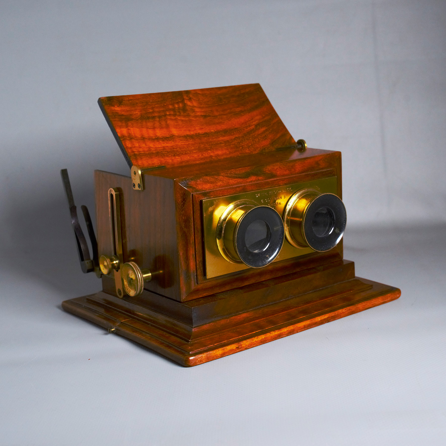 Fein gearbeitetes, kleines Tisch-Stereoskop der bekannten Londoner Optikfirma Smith, Beck & Beck, geführt von den Brüdern Richard und Joseph Beck. Der Apparat diente der genaueren Betrachtung von Stereo-Photografien u. a.; ausgestattet mit seitlichen Fokussierrädern sowie messinggefassten Okularen. – Altersgemäß sehr gut erhalten. Mahagoniholz mit leichten Gebrauchsspuren und partiellen Abriebstellen, vereinzelten Bestoßungen. Optische Gläser klar. Aufbewahrungskasten mit leichten Kratz- und Schabspuren, insgesamt gepflegter Gesamteindruck.