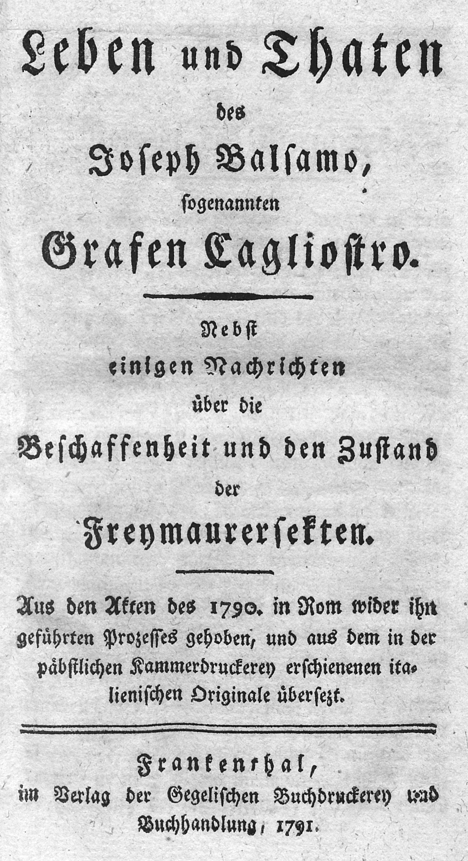 (Marcello, Stefano Antonio). Leben und Thaten des Joseph Balsamo, sogenannten Cagliostro. Nebst einigen Nachrichten über die Beschaffenheit und den Zustand der Freymaurersekten. Aus den Akten des 1790. in Rom wider ihn geführten Prozesses gehoben, und aus dem in der päbstlichen Kammerdruckerey erschienenen italienischen Original übersetzt. XII, 171 S. 18 x 11,5 cm. Pappband d. Z. (berieben und bestoßen) mit hs. RSchild. Zürich, Orell u. a., 1791.