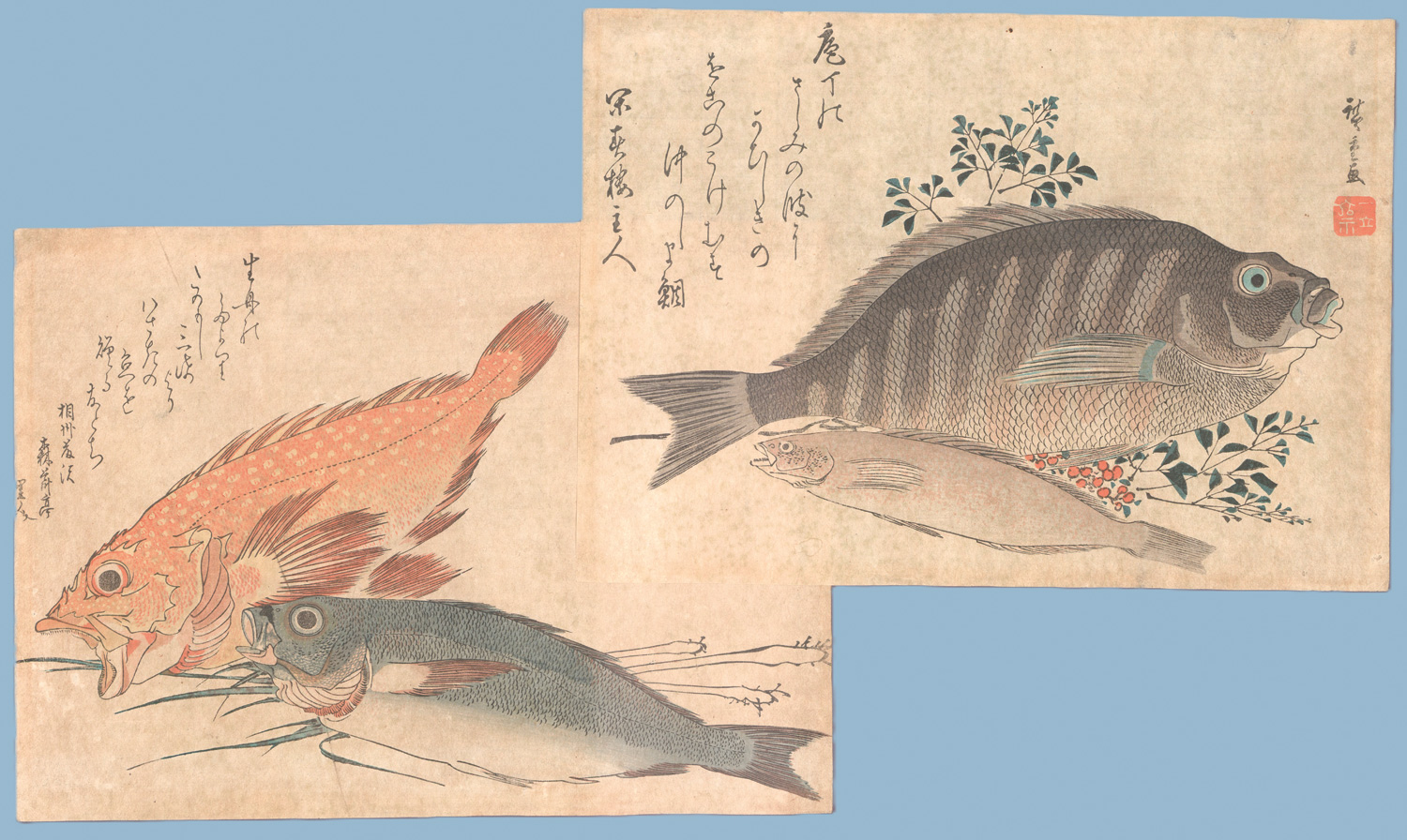 Dargestellt sind verschiedene Fischarten, wie die Felsenforelle, Meerbrassen, Wolfsbarsch, Golden-eyed Sea Bream, Skorpionfisch und Isaki. Neben den Fischen sind auch Pflanzen wie Ingwer, Himmelsbambus und Perilla abgebildet. – Papierbedingt etwas gebräunt, sonst gute Exemplare.
